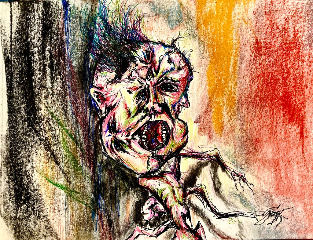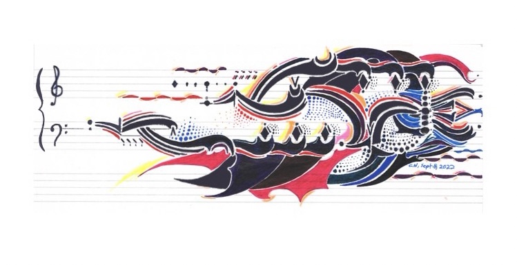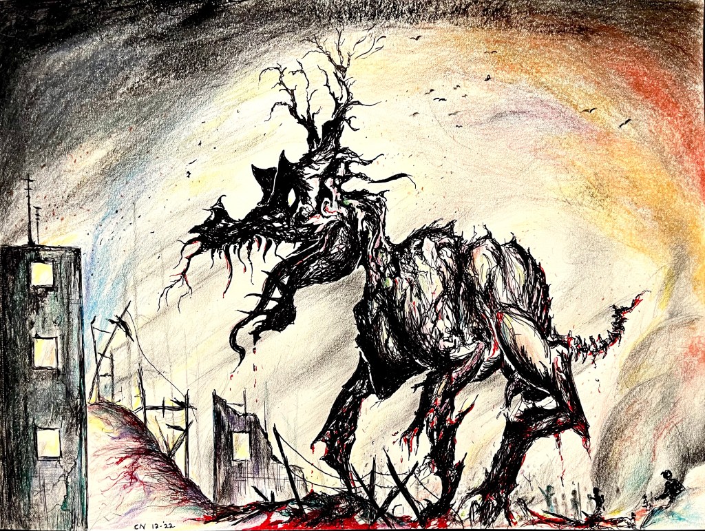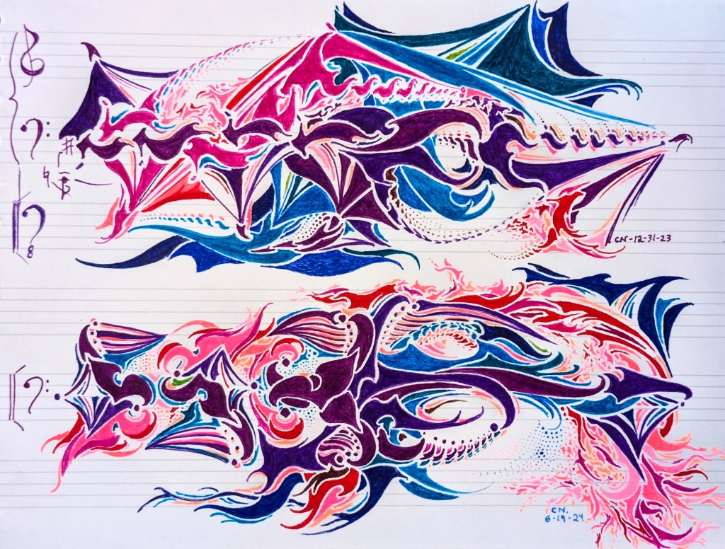 nativitas beatae Mariae virginis ((2024)“nulla iniuria responsa” (August 2024)Envelopes, I & II (December 2023-July 2024)Envelopes, No.1(December 2023)- mid stageEnvelopes, No.1(December 2023)- early stage“At Once” (9/14/2024) 10-minute drawingAward-winning 10-minute painting, “Chickens in a Field of Flowers” (2024)“Prehistoric New Mexican Bird 1. “Tsidiiyazhi abini” (ancient mousebird) (2023) Pen and ink, pencil, and charcoal on printer stock.“Hot People in Love” (2023) – Pen and Ink on Drawing Paper: For G (2/14/23)“Sequenza espiritu sancti” no. I (2023)“Sequenza espiritu sancti” nos II & III (2023)“Sequenza espiritu sancti” no. IV (2023)“Daemon with Brittle Bones” (12/21/2022)“Filthy Dancing” (09/11/2022)- Pen and Ink, and Crayon on Music Stave-Lined Card Stock“soma deer”, Framed Render – pen and ink on drawing paper (May 6, 2022)“Nautilus”- pen & ink on staff-lined drawing paper (2/22/2022)“Bird of Paradise”- pen and ink on drawing paper (02/19/22)“agōgimon” -pen and ink on drawing paper (2021)“Human Form Furnace”- pen and ink on drawing paper (2021)“tes mots sont des mensonges”- pen, pencil, crayon and charcoal on printer stock (2021)“sauvagine joyeuse” (2021)- pen and ink on printer stock (8.5x 11)“sauvagine joyeuse”, Middle Period Render- pen and ink on printer stock (2021)“sauvagine joyeuse”, Iconographic Render II- pen and ink on printer stock (2021)“sauvagine joyeuse”, Iconographic Render I- pen and ink on printer stock (2021)“Shopping Person” (12/30/2021)- pen, pencil, pastel, and crayon on drawing paper (ca. 5×9)“Horses Breaking Through the Frothing Sea”- pen and ink on printer stock (July 26, 2021)“A Horses Breaking Through the Frothing Sea”, Detail I, Clouds (2021)“A Horses Breaking Through the Frothing Sea”, Detail II, Wave (2021)“A Horses Breaking Through the Frothing Sea”, Detail III, Horses (Muted Red)(2021)“Horses Breaking Through the Frothing Sea”, Detail III, Mirrored Horses (Muted Red)(2021)“Dancer”, Render 2 (2020)- pen and pencil on drawing paperShipwreck I (2019)- crayon and charcoal on printer stock“Westward View from the Sandia Crest” (2019)- crayon and acrylic on printer stock“Bosque on the Rio Grande” (2019)- crayon, and acrylic on printer stockSunset, West Mesa (2018)- crayon on printer stock“Blue Springs” (2018)- crayon on printer stock“Roosevelt Park in the Dark” (2017)- crayon on printer stock“Bird Study”- pen and ink on printer stock (2014)“Bird Study”, Detail I- pen and ink on printer stock (2014)“Bird Study”, Detail II- pen and ink on printer stock (2014)“Cat Study” (2013)- Pen and ink on drawing paper